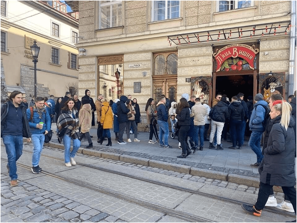 После того, как в военной администрации сообщили о возобновлении продаж алкогольных напитков, в соцсетях появились фото большой очереди, выстроившейся к кафе “Пьяная вишня”, расположенному напротив Львовской Ратуши. Можно было увидеть ажиотаж также в “Ашане” и других местах.